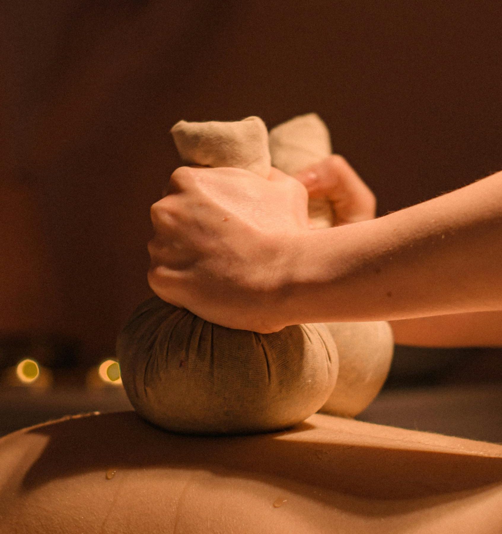 Un abhyanga suivi du passage de pochons aux plantes, faits maison et chauffés, par des mouvements de pression/rotation et de légères percussions rythmées.